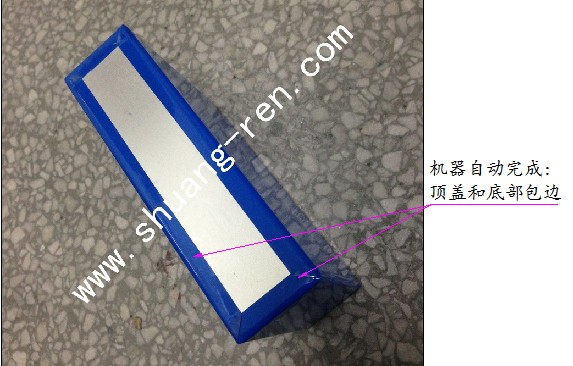 手動放入電池到滑動滾筒上放,雙手按啟動按鈕==>推力夾具推動電池==>電池阻力夾具定位電池==>卷料放卷,背膠滾筒背膠==>下滾筒滾膠并復(fù)位==>備膠滾筒移動背膠 ==>切刀切膠==>備膠滾筒復(fù)位==>上滾筒下移滾膠并復(fù)位==>接駁滾筒傳送電池出料==>定位后包邊機(jī)構(gòu)包裹上下邊==>接駁傳送電池出料。