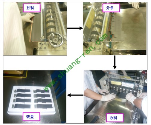 1.人工將產(chǎn)品放入下料口,通過自動送料裝置將產(chǎn)品送入刀口,分切后由人工收料;