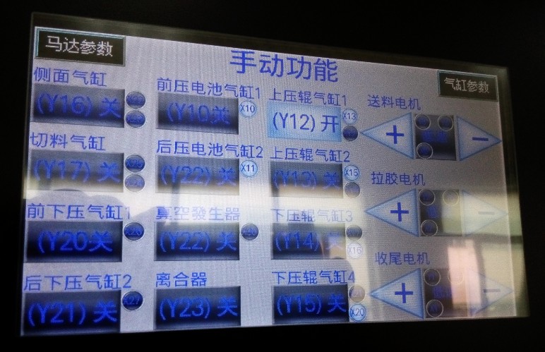 手動(dòng)放入電池到滑動(dòng)滾筒上放,雙手按啟動(dòng)按鈕==>推力夾具推動(dòng)電池==>電池阻力夾具定位電池==>卷料放卷,背膠滾筒背膠==>下滾筒滾膠并復(fù)位==>備膠滾筒移動(dòng)背膠 ==>切刀切膠==>備膠滾筒復(fù)位==>上滾筒下移滾膠并復(fù)位==>接駁滾筒傳送電池出料==>定位后包邊機(jī)構(gòu)包裹上下邊==>接駁傳送電池出料。